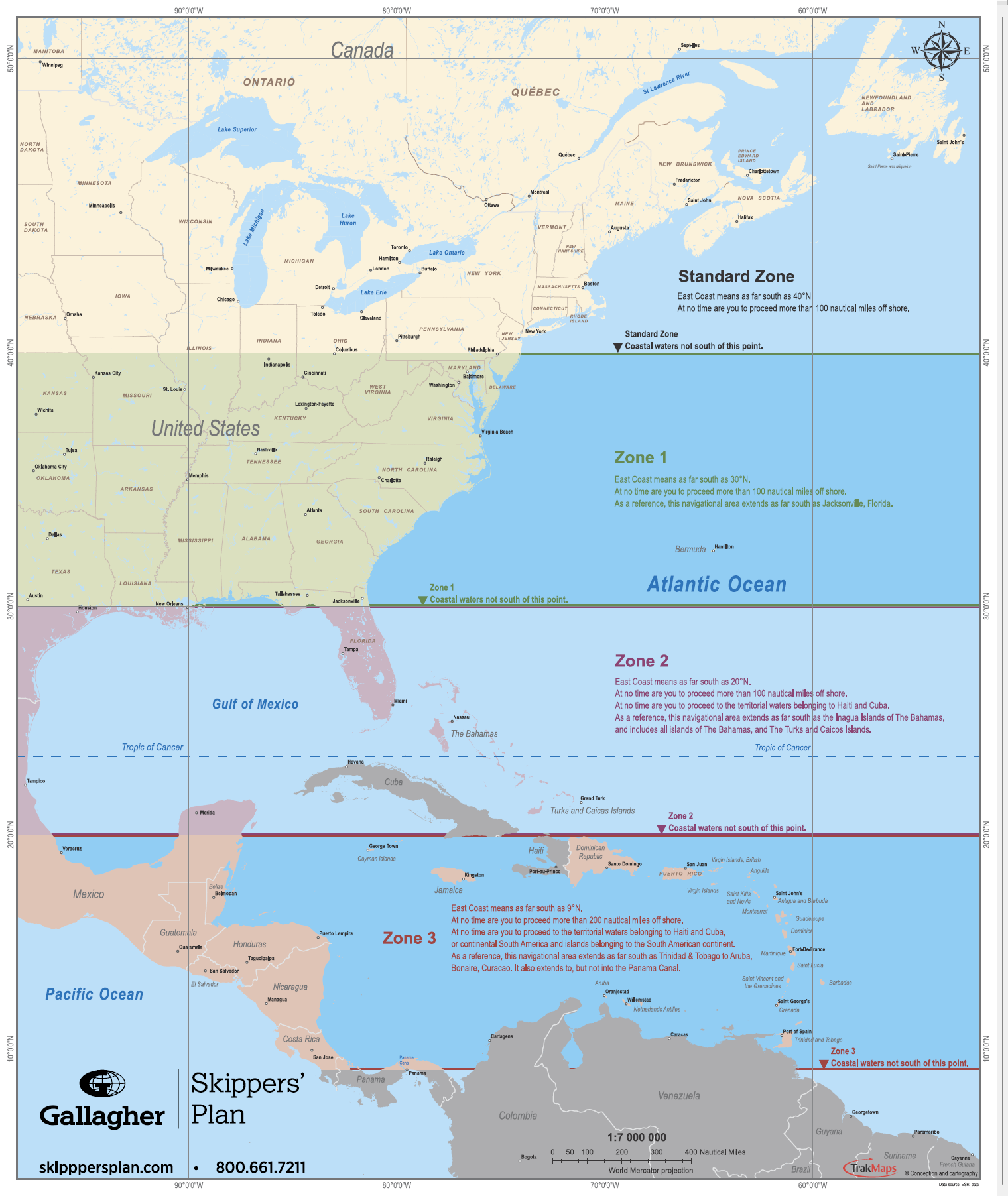 “Zone Three – East Coast” means as far south as 9° N. At no time are you to proceed more than 200 nautical miles off shore. At no time are you to proceed to the territorial waters belonging to Haiti, Cuba, or continental South America and islands belonging to the South American continent. As a reference, this navigational area extends as far south as Trinidad & Tobago to Aruba / Bonaire / Curaçao. It also extends to, but not into the Panama Canal.